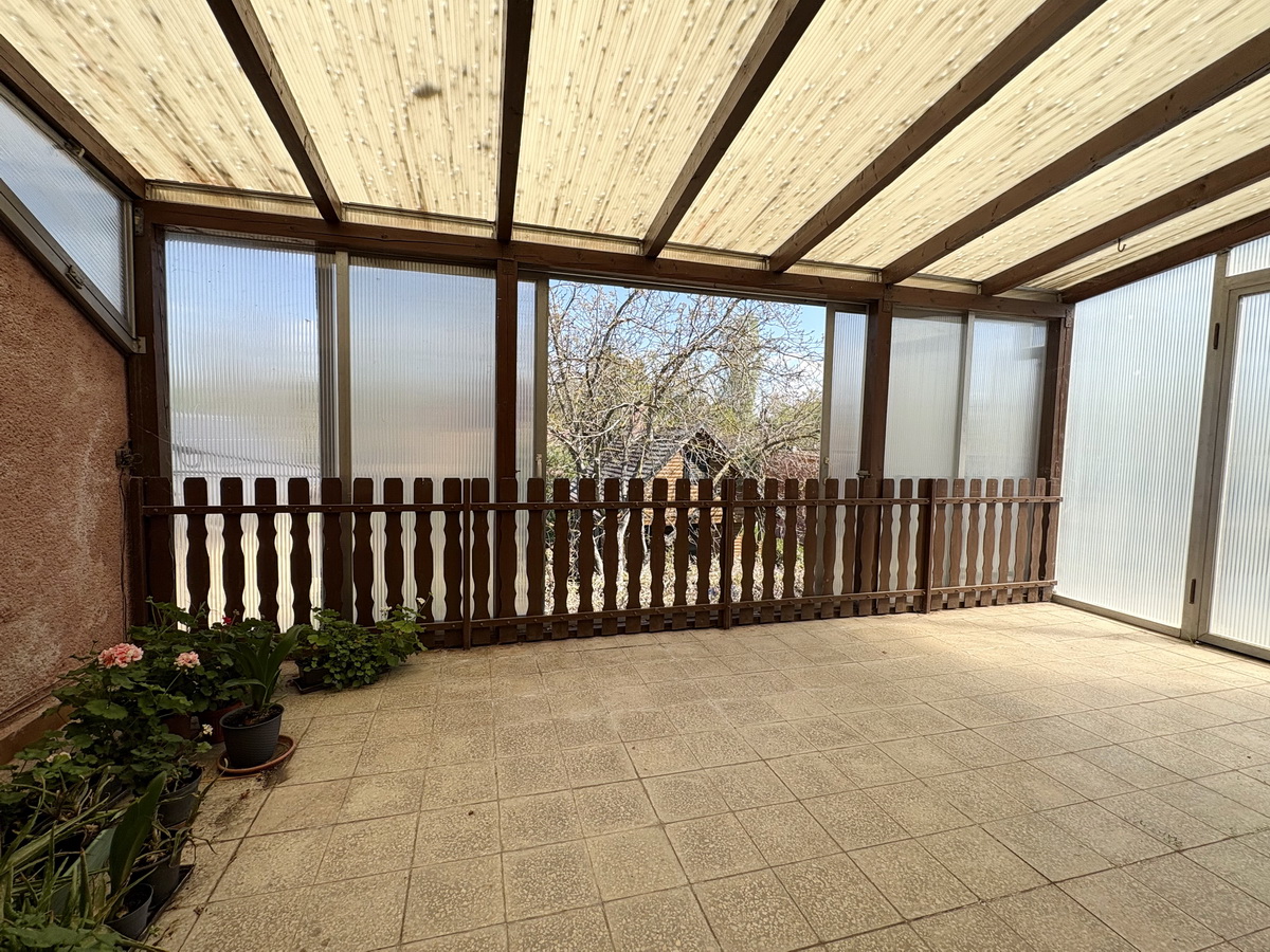 Kertváros frekventált részén 119 m2-es, 3 szoba + nappali + étkezős, fedett emeleti és kertkapcsolatos teraszos szélső sorház, + lakható kis faház...